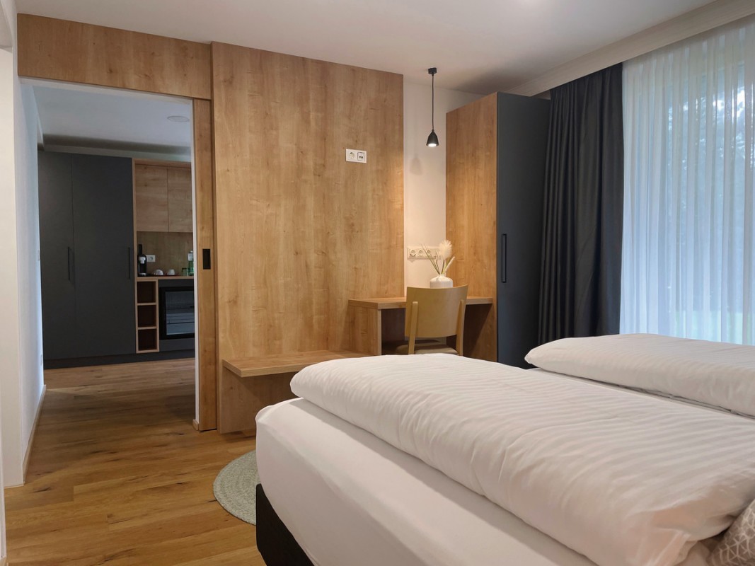 Wellnesszimmer: Schlaf- und Wohnzimmer – getrennt durch eine Schiebetür; Doppelbett und ausziehbare Doppelcouch, mit privater Sauna