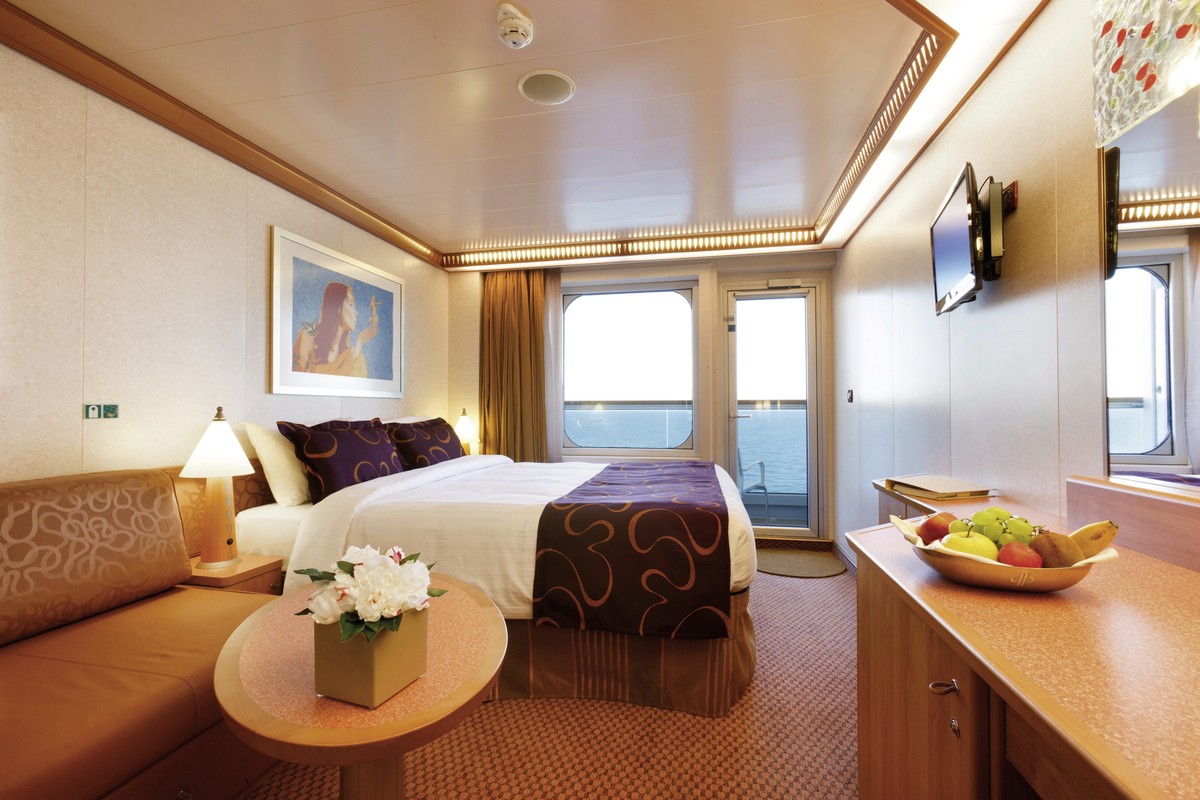 Die Kabinen sind alle modern eingerichtet und verfügen über 2 Einzelbetten (zu einem Doppelbett arrangierbar), Bad oder Dusche/WC, Haarföhn, Klimaanlage, Sat-TV, WLAN (gegen Gebühr), Safe und Minibar (gegen Gebühr).