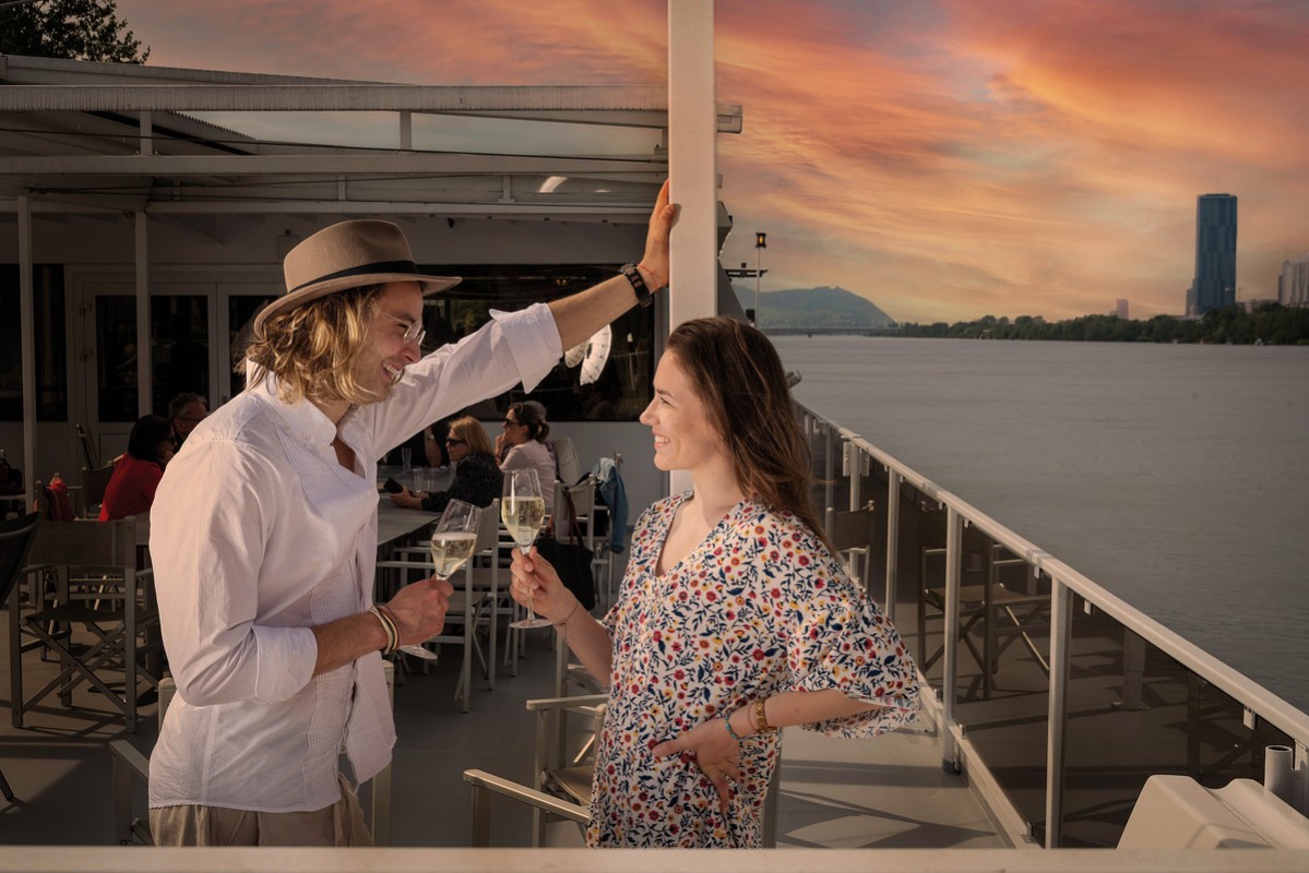 18 Uhr: Einstieg – Wien/Reichsbrücke (Handelskai 265, 1020 Wien) Anlegestelle Nr. 6