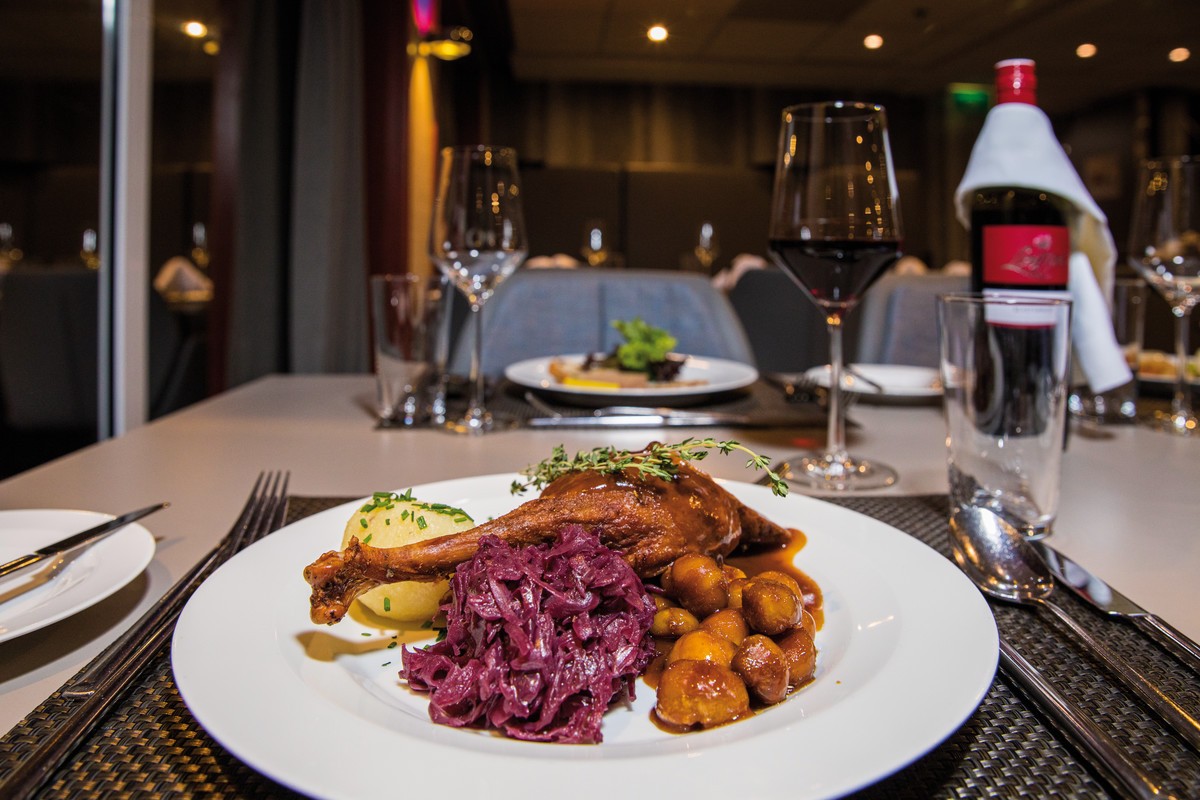 Abends lädt die Crew zum Martini-Gansl-Essen in das Bordrestaurant. Währenddessen verlässt die MS Nestroy den Hafen von Bratislava, um wieder flussaufwärts zu steuern.