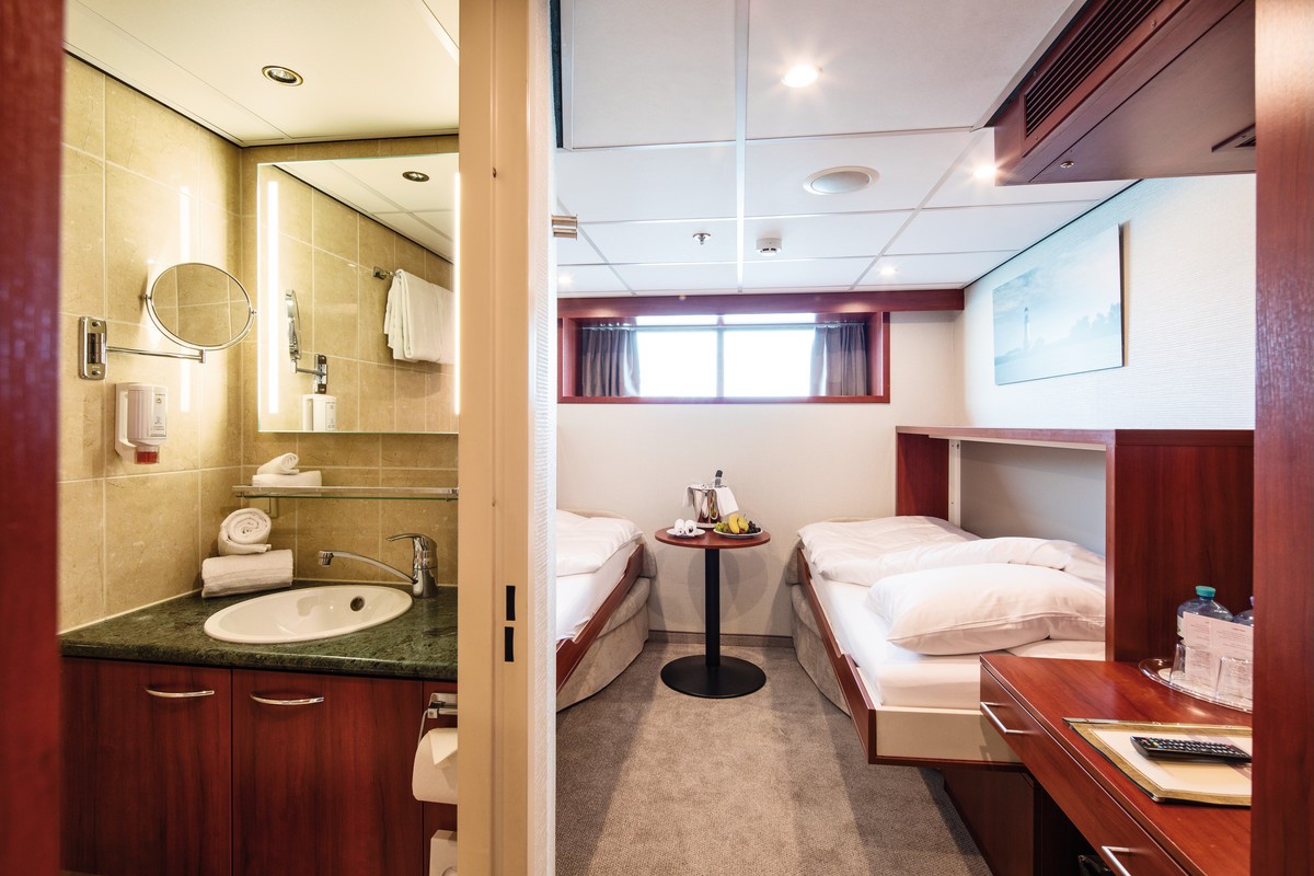Die Kabinen (ca. 12 m²) verfügen über Dusche/WC, Föhn, TV, Bordtelefon, Safe, Heizung, 220 Volt Stromversorgung sowie individuell regulierbarer Klimaanlage.