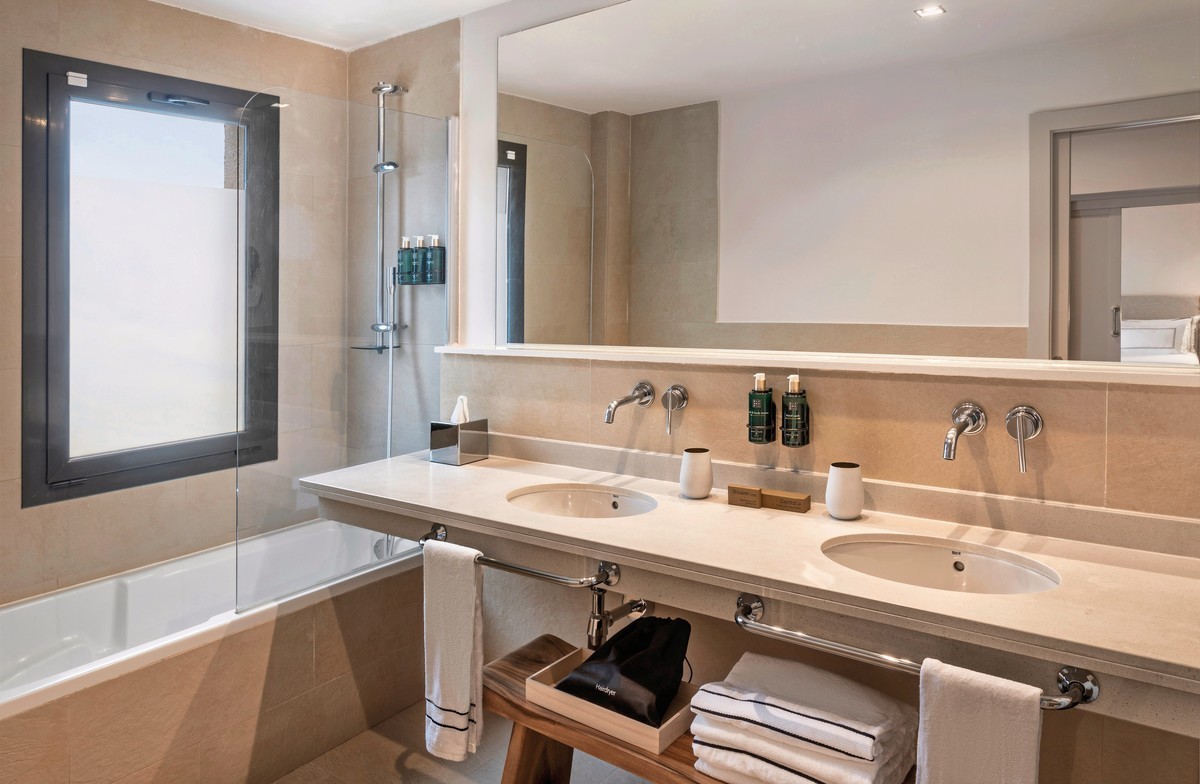 - 26-30 qm, Doppel, Poolblick, Bettwäsche, Handtücher und Matratzen aus 100% Bio-Baumwolle, 1 Bad, Dusche oder Badewanne, WC, Haartrockner, Klimaanlage, Heizung, Minibar kostenpflichtig, Safe, TV (Sat-TV, Flachbildschirm), WLAN, Balkon oder Terrasse (möbliert), Kopfkissen-Menü, hochwertige Badartikel