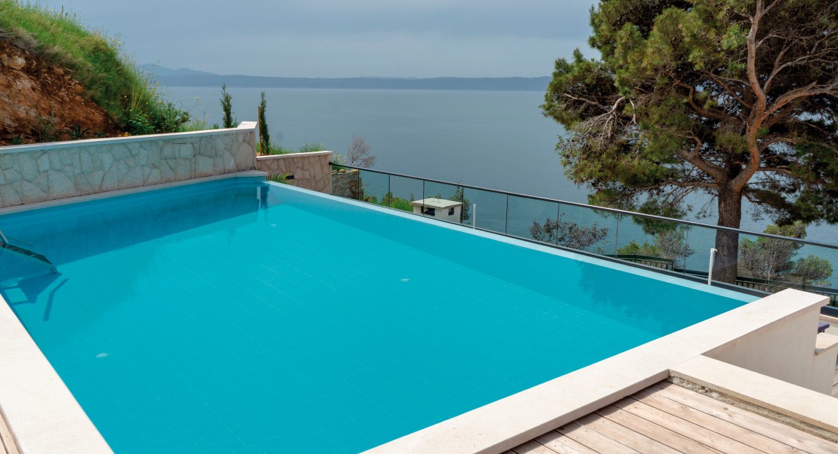Gut zu wissen: Auf der traumhaften Sonnenterrasse mit Liegen und einem beheizten Süßwasserpool kann man sich richtig entspannen und den Blick aufs nur 30m entfernte blaue Meer genießen.